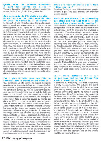 I felt very honoured when the editorial department contacted me with the request of an interview for the premiere issue of the magazine. Sweet, 6 pages covering everything from how I got into kiting, my background and life before turning pro, career highlights, travels, dreams & thoughts about the industry and of course other issues related to a kite-chick pro life.