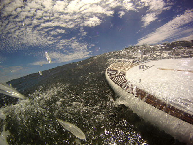 The 9’6” drives off the tail and winds up speed with a racy tri-fin set-up. It’s super easy to handle too and although the boards specs were certainly a bit on the ‘short side’ for small waves like on that boat-trip, it was super easy for me to paddle myself into them 🙂 ! The fishtail shape certainly is very supportive in both acceleration and wave-catching lift. The CAD-engineered volume flow and flat deck, really help big time with regards to stability and balance. Well and with regards to the truly amazing Wood Sandwich Light Construction and super stylish looks of it, there’s no other words than: F U L L Y S I C K 🙂 !